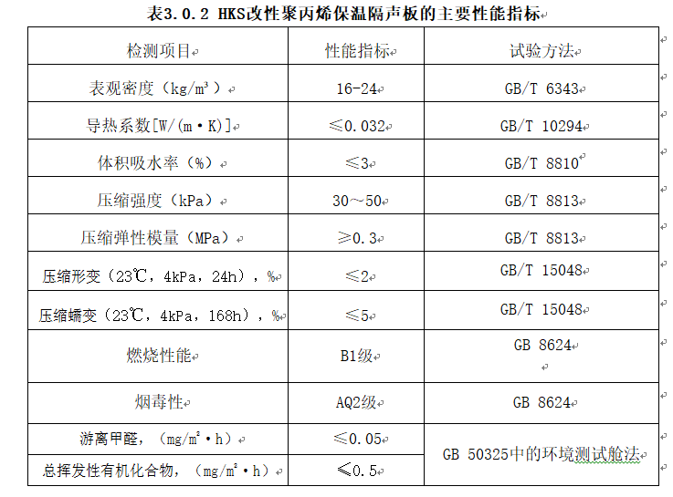 改性聚丙烯保溫隔聲板主要性能指標